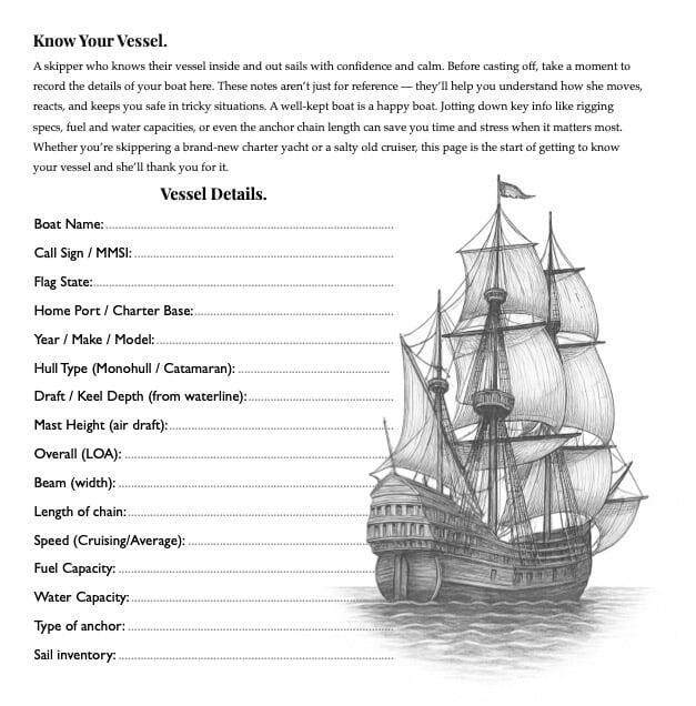 a skipper’s quick reference for specs, safety gear, and vital checks, keeping your boat’s details ready when it counts.