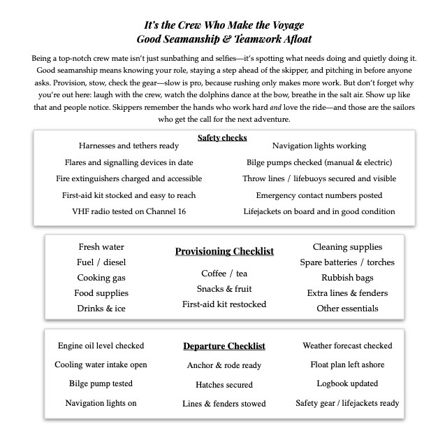 Checklists — essential pre-departure and end-of-charter reminders, from safety gear and provisions to engine checks, helping every voyage start and finish smoothly.