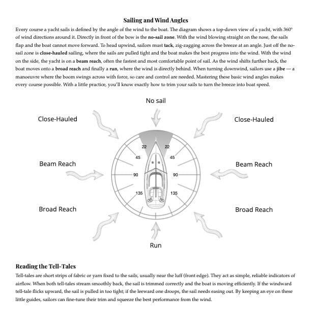 Wind Angles & Tell-Tales — understand sail trim at a glance. Decode wind direction, sheet tension, and sail shape for smoother, faster passages.
