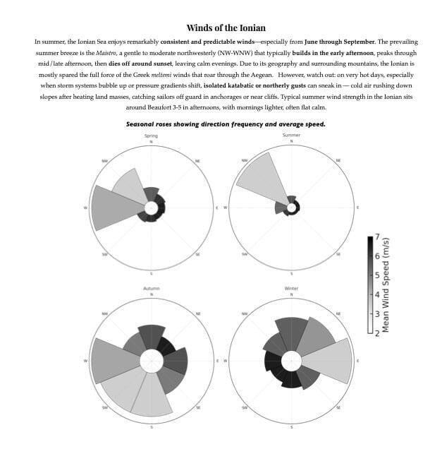 Prevailing Wind Data — regional wind patterns at a glance, showing when and how the local breezes shift through the seasons to guide your sails.