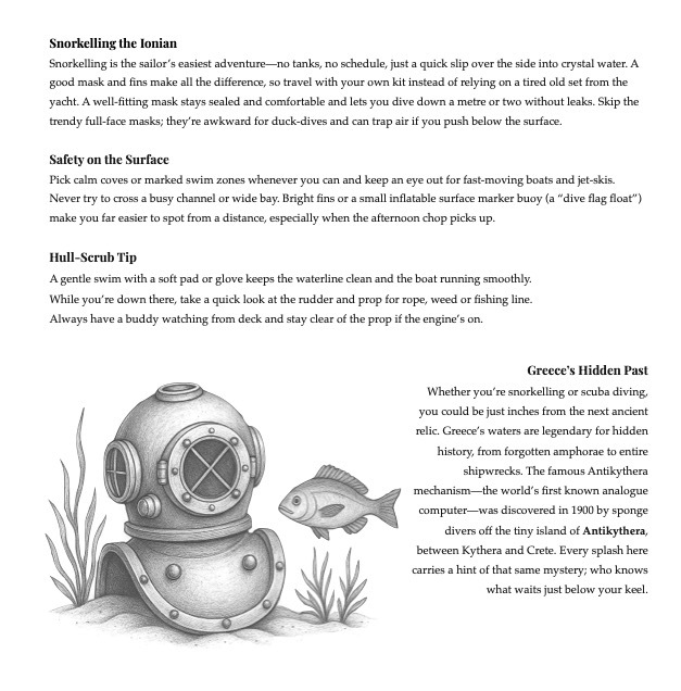 Conservation & Respect — gentle reminders to protect marine life and local habitats, encouraging mindful anchoring, responsible waste handling, and eco-friendly sailing practices.