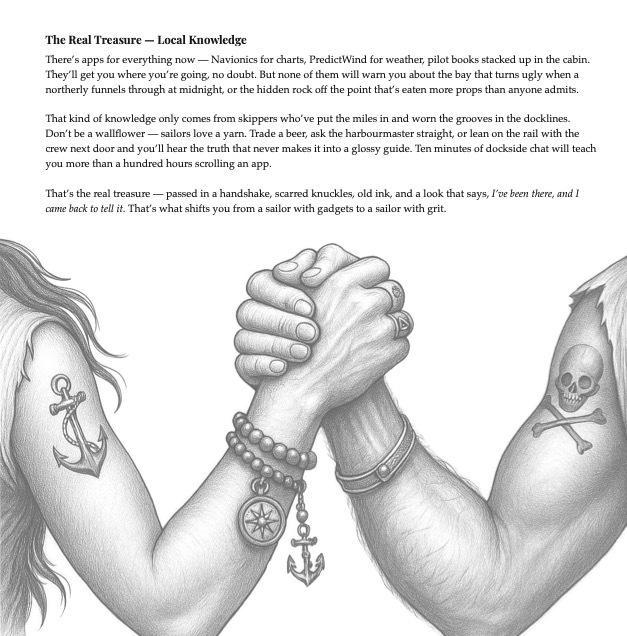 The Real Treasure – Local Knowledge — where wisdom isn’t downloaded but shared. Every harbour has its secrets; the best ones are found over beers, not in apps.
